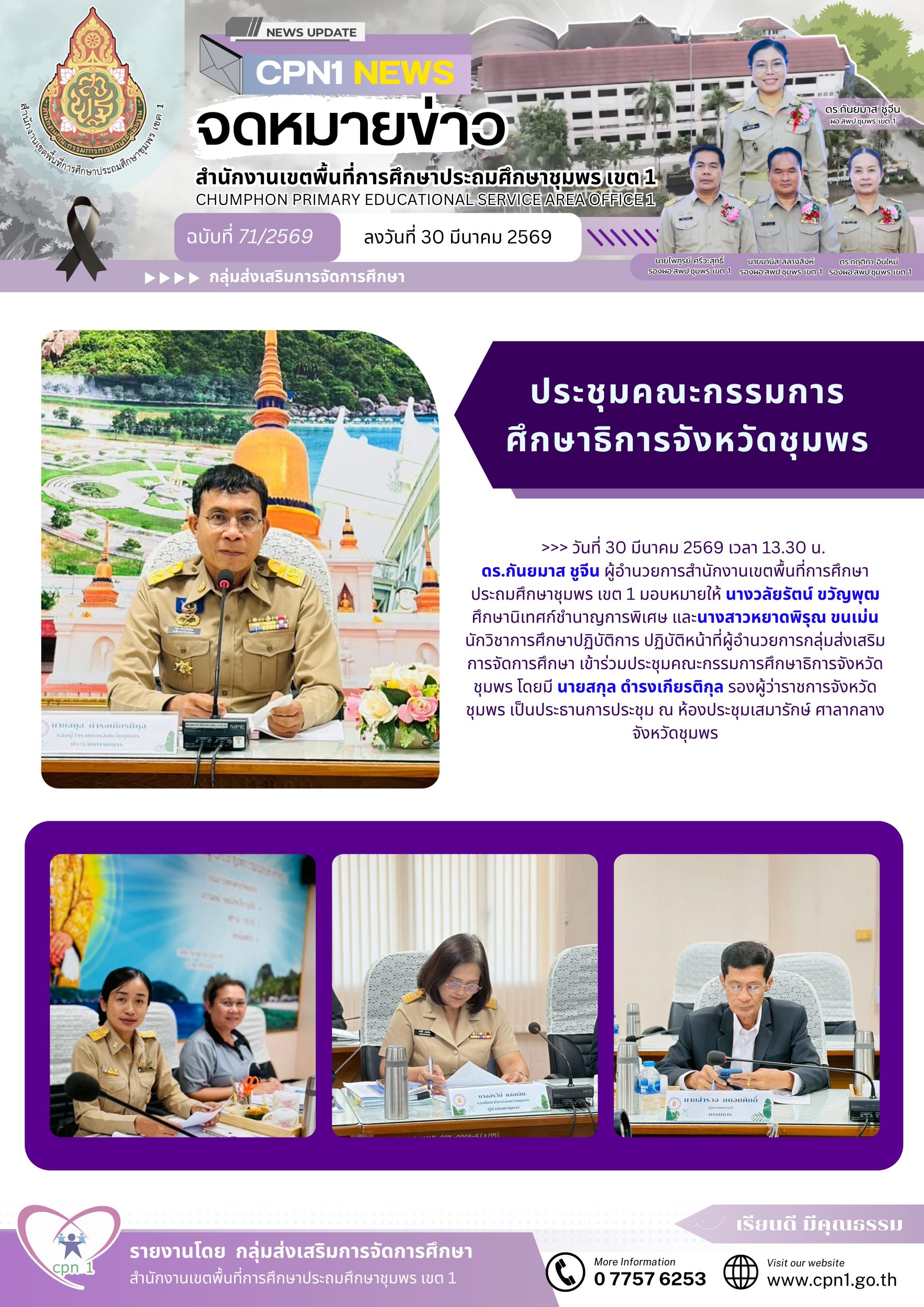 >>> วันที่ 30 มีนาคม 2569 เวลา 13.30 น. ดร.กันยมาส ชูจีน ผู้อำนวยการสำนักงานเขตพื้นที่การศึกษาประถมศึกษาชุมพร เขต 1 มอบหมายให้ นางวลัยรัตน์ ขวัญพุฒ ศึกษานิเทศก์ชำนาญการพิเศษ และนางสาวหยาดพิรุณ ขนเม่น นักวิชาการศึกษาปฏิบัติการ ปฏิบัติหน้าที่ผู้อำนวยการกลุ่มส่งเสริมการจัดการศึกษา เข้าร่วมประชุมคณะกรรมการศึกษาธิการจังหวัดชุมพร โดยมี นายสกุล ดำรงเกียรติกุล รองผู้ว่าราชการจังหวัดชุมพร เป็นประธานการประชุม ณ ห้องประชุมเสมารักษ์ ศาลากลางจังหวัดชุมพร