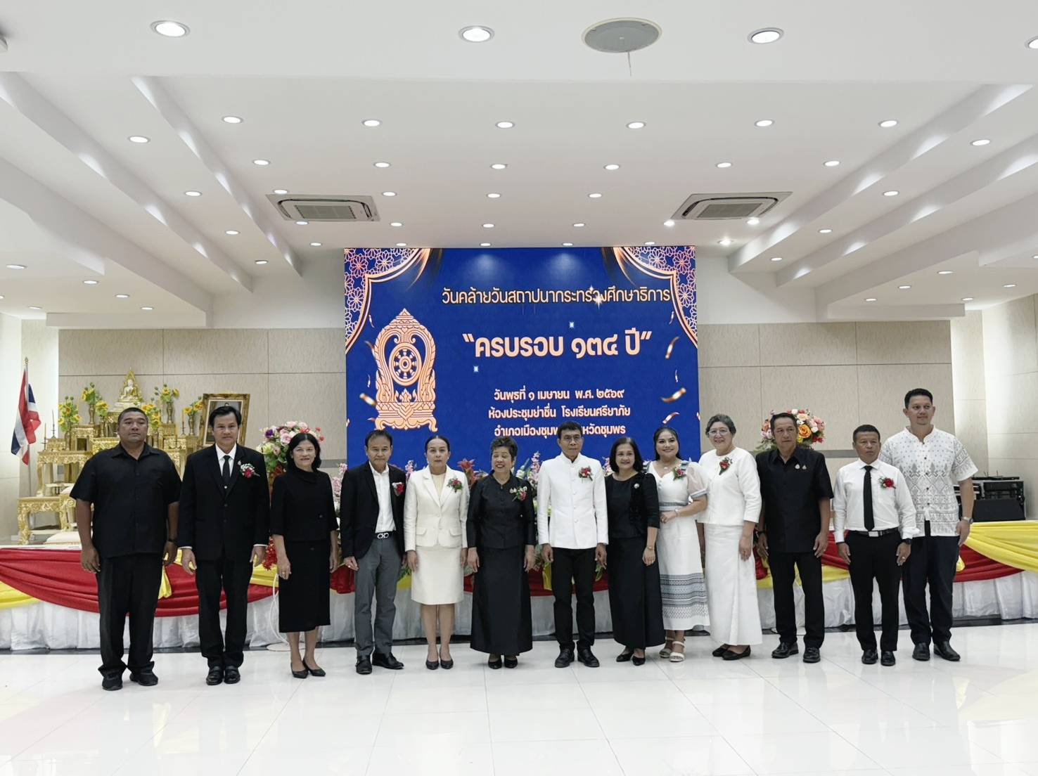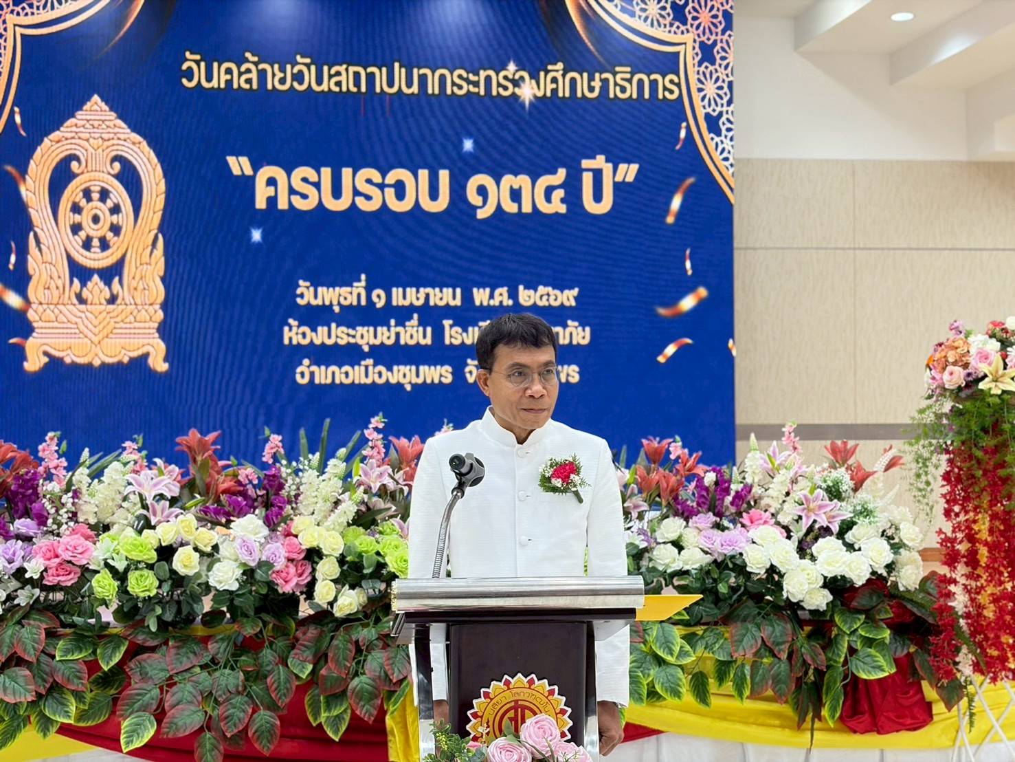 วันที่ 1 เมษายน 2569 เวลา 07.30 น. ดร.กันยมาส ชูจีน ผู้อำนวยการสำนักงานเขตพื้นที่การศึกษาประถมศึกษาชุมพร เขต 1 มอบหมายให้ ดร.กฤติกา อินใหม่ รองผู้อำนวยการสำนักงานเขตพื้นที่การศึกษาประถมศึกษาชุมพร เขต 1 พร้อมด้วย นางกาญจนา พัดพา ผู้อำนวยการกลุ่มอำนวยการ, นางสาวธีมาพร นิลมานนท์ ผู้อำนวยการกลุ่มส่งเสริมการศึกษาทางไกลเทคโนโลยีสารสนเทศและการสื่อสาร และบุคลากรในสังกัดสำนักงานเขตพื้นที่การศึกษาประถมศึกษาชุมพรเขต 1 ร่วมกิจกรรมวันคล้ายวันสถาปนากระทรวงศึกษาธิการ ครบรอบ 134 ปี ณ ห้องประชุมย่าชื่น โรงเรียนศรียาภัย อำเภอเมืองชุมพร จังหวัดชุมพร โดยมี นายสกุล ดำรงเกียรติกุล รองผู้ว่าราชการจังหวัดชุมพร เป็นประธานในพิธี