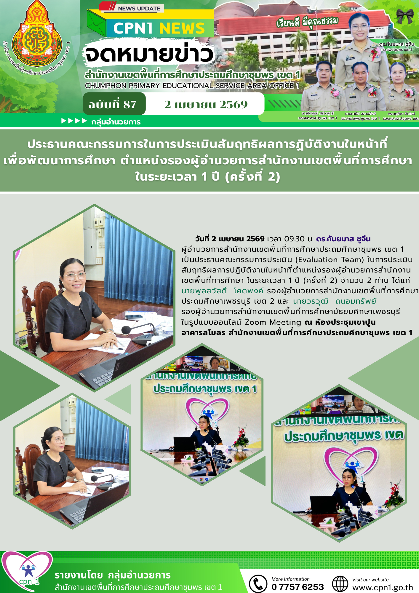 วันที่ 2 เมษายน 2569 เวลา 09.30 น. ดร.กันยมาส ชูจีน ผู้อำนวยการสำนักงานเขตพื้นที่การศึกษาประถมศึกษาชุมพร เขต 1 เป็นประธานคณะกรรมการประเมิน (Evaluation Team) ในการประเมินสัมฤทธิผลการปฏิบัติงานในหน้าที่ตำแหน่งรองผู้อำนวยการสำนักงานเขตพื้นที่การศึกษา ในระยะเวลา 1 ปี (ครั้งที่ 2) จำนวน 2 ท่าน ได้แก่ นายพูลสวัสดิ์ โคตพงค์ รองผู้อำนวยการสำนักงานเขตพื้นที่การศึกษาประถมศึกษาเพชรบุรี เขต 2 และ นายวรวุฒิ ถนอมทรัพย์ รองผู้อำนวยการสำนักงานเขตพื้นที่การศึกษามัธยมศึกษาเพชรบุรี ในรูปแบบออนไลน์ Zoom Meeting ณ ห้องประชุมเขาปูน อาคารสโมสร สำนักงานเขตพื้นที่การศึกษาประถมศึกษาชุมพร เขต 1