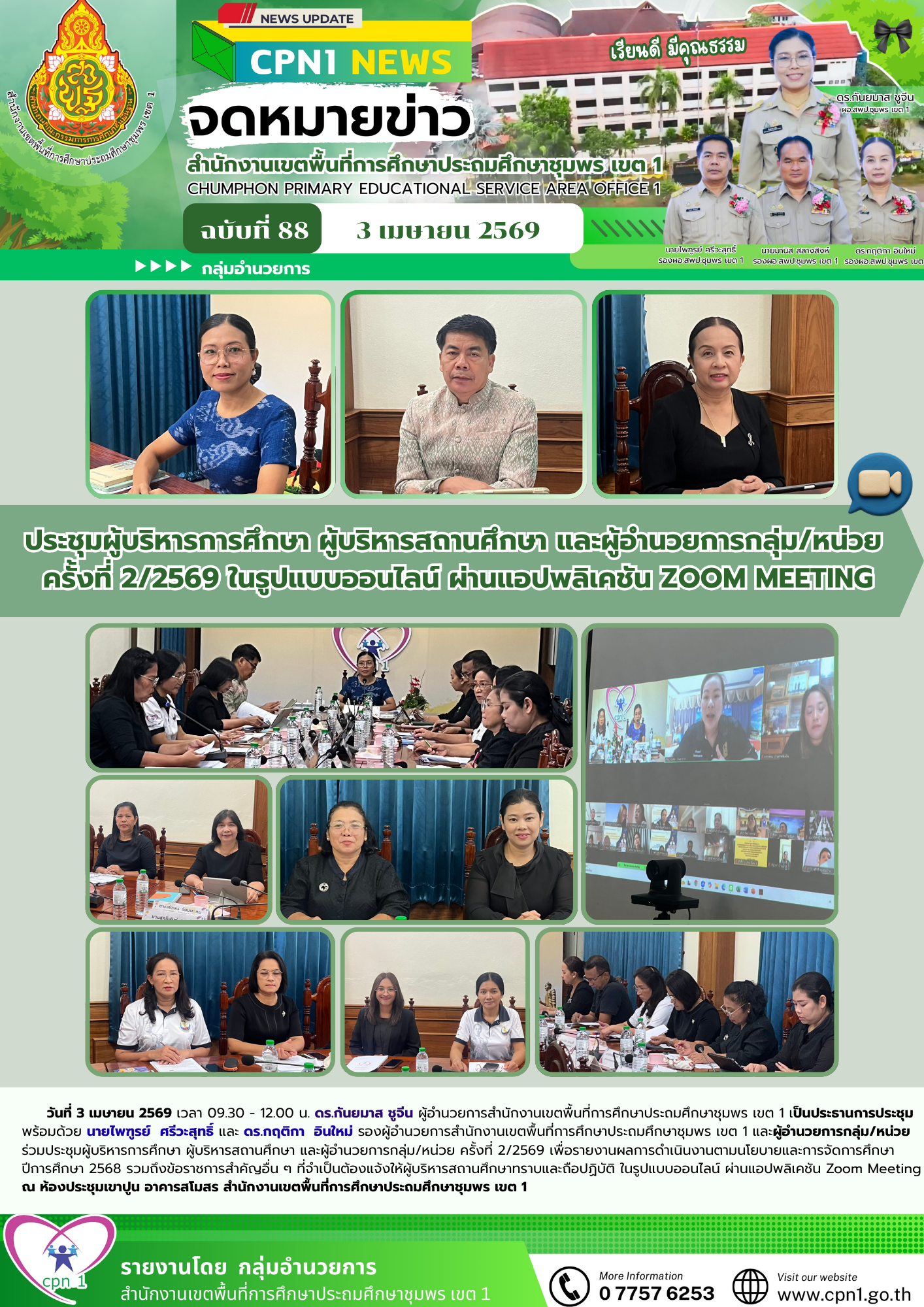 วันที่ 3 เมษายน 2569 เวลา 09.30 – 12.00 น. ดร.กันยมาส ชูจีน ผู้อำนวยการสำนักงานเขตพื้นที่การศึกษาประถมศึกษาชุมพร เขต 1 เป็นประธานการประชุม พร้อมด้วย นายไพฑูรย์ ศรีวะสุทธิ์ และ ดร.กฤติกา อินใหม่ รองผู้อำนวยการสำนักงานเขตพื้นที่การศึกษาประถมศึกษาชุมพร เขต 1 และผู้อำนวยการกลุ่ม/หน่วย ร่วมประชุมผู้บริหารการศึกษา ผู้บริหารสถานศึกษา และผู้อำนวยการกลุ่ม/หน่วย ครั้งที่ 2/2569 เพื่อรายงานผลการดำเนินงานตามนโยบายและการจัดการศึกษา ปีการศึกษา 2568 รวมถึงข้อราชการสำคัญอื่น ๆ ที่จำเป็นต้องแจ้งให้ผู้บริหารสถานศึกษาทราบและถือปฏิบัติ ในรูปแบบออนไลน์ ผ่านแอปพลิเคชัน Zoom Meeting ณ ห้องประชุมเขาปูน อาคารสโมสร สำนักงานเขตพื้นที่การศึกษาประถมศึกษาชุมพร เขต 1