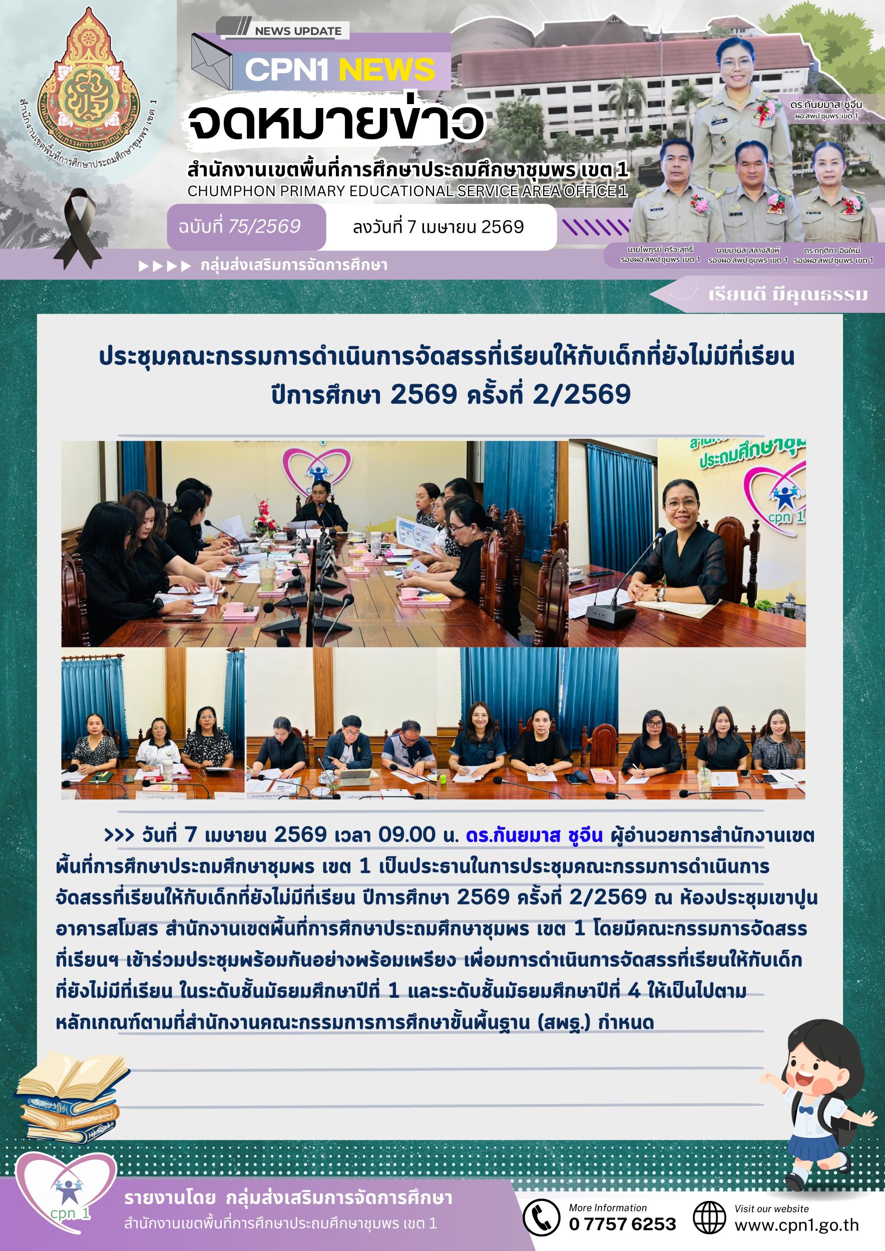 >>> วันที่ 7 เมษายน 2569 เวลา 09.00 น. ดร.กันยมาส ชูจีน ผู้อำนวยการสำนักงานเขตพื้นที่การศึกษาประถมศึกษาชุมพร เขต 1 เป็นประธานในการประชุมคณะกรรมการดำเนินการจัดสรรที่เรียนให้กับเด็กที่ยังไม่มีที่เรียน ปีการศึกษา 2569 ครั้งที่ 2/2569 ณ ห้องประชุมเขาปูน อาคารสโมสร สำนักงานเขตพื้นที่การศึกษาประถมศึกษาชุมพร เขต 1 โดยมีคณะกรรมการจัดสรรที่เรียนฯ เข้าร่วมประชุมพร้อมกันอย่างพร้อมเพรียง เพื่อการดำเนินการจัดสรรที่เรียนให้กับเด็กที่ยังไม่มีที่เรียน ในระดับชั้นมัธยมศึกษาปีที่ 1 และระดับชั้นมัธยมศึกษาปีที่ 4 ให้เป็นไปตามหลักเกณฑ์ตามที่สำนักงานคณะกรรมการการศึกษาขั้นพื้นฐาน (สพฐ.) กำหนด