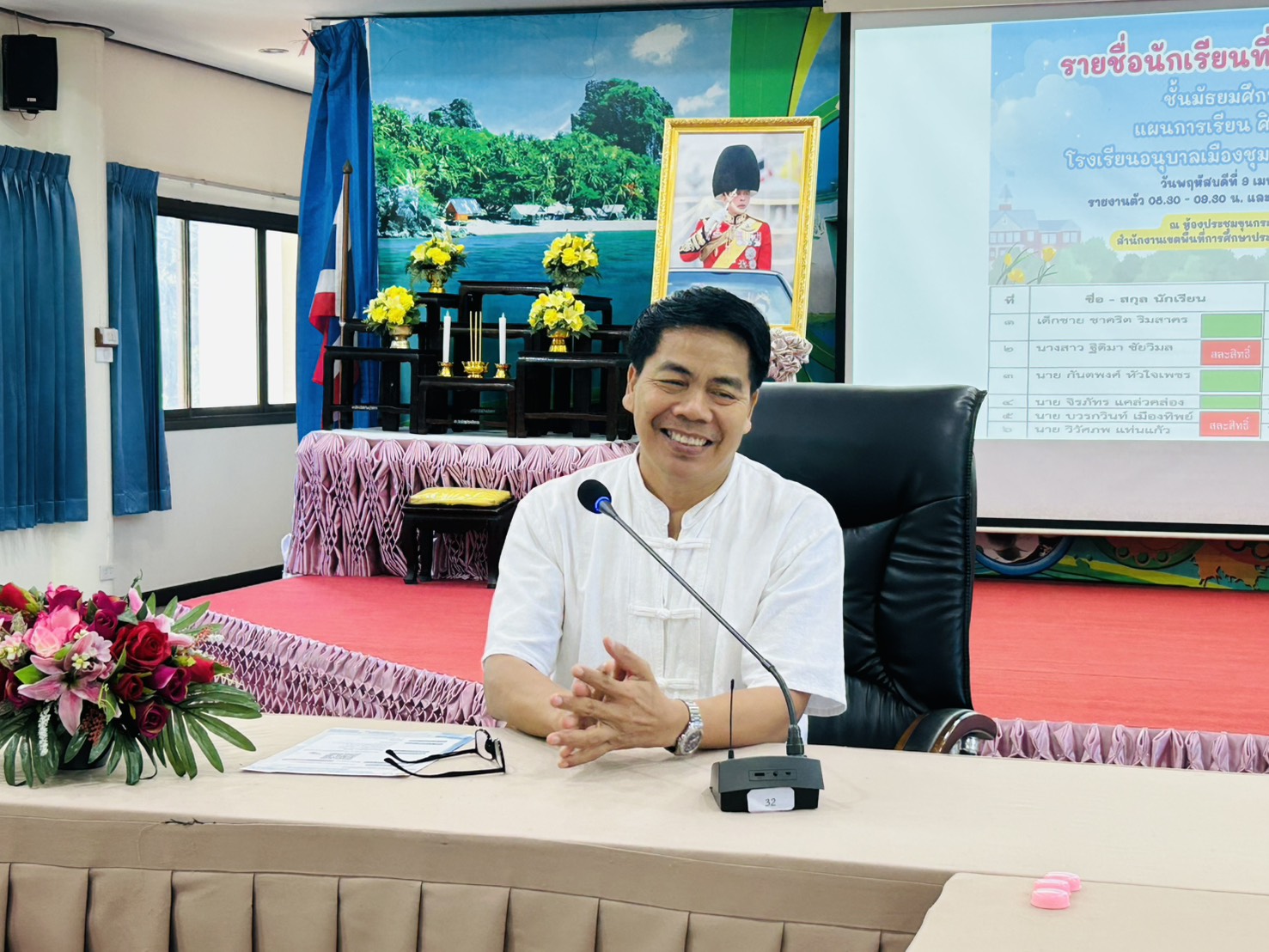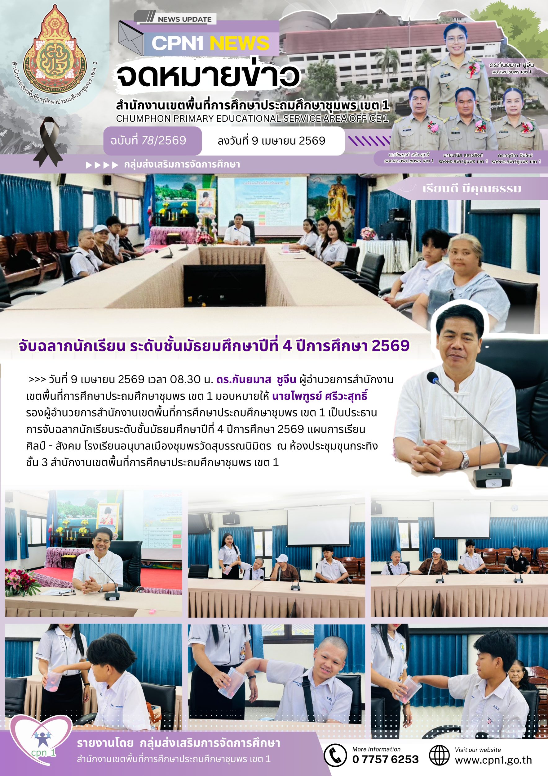 >>> วันที่ 9 เมษายน 2569 เวลา 08.30 น. ดร.กันยมาสชูจีน ผู้อำนวยการสำนักงานเขตพื้นที่การศึกษาประถมศึกษาชุมพร เขต 1 มอบหมายให้ นายไพฑูรย์ ศรีวะสุทธิ์ รองผู้อำนวยการสำนักงานเขตพื้นที่การศึกษาประถมศึกษาชุมพร เขต 1 เป็นประธาน การจับฉลากนักเรียนระดับชั้นมัธยมศึกษาปีที่ 4 ปีการศึกษา 2569 แผนการเรียนศิลป์ – สังคม โรงเรียนอนุบาลเมืองชุมพรวัดสุบรรณนิมิตร ณ ห้องประชุมขุนกระทิง ชั้น 3 สำนักงานเขตพื้นที่การศึกษาประถมศึกษาชุมพร เขต 1