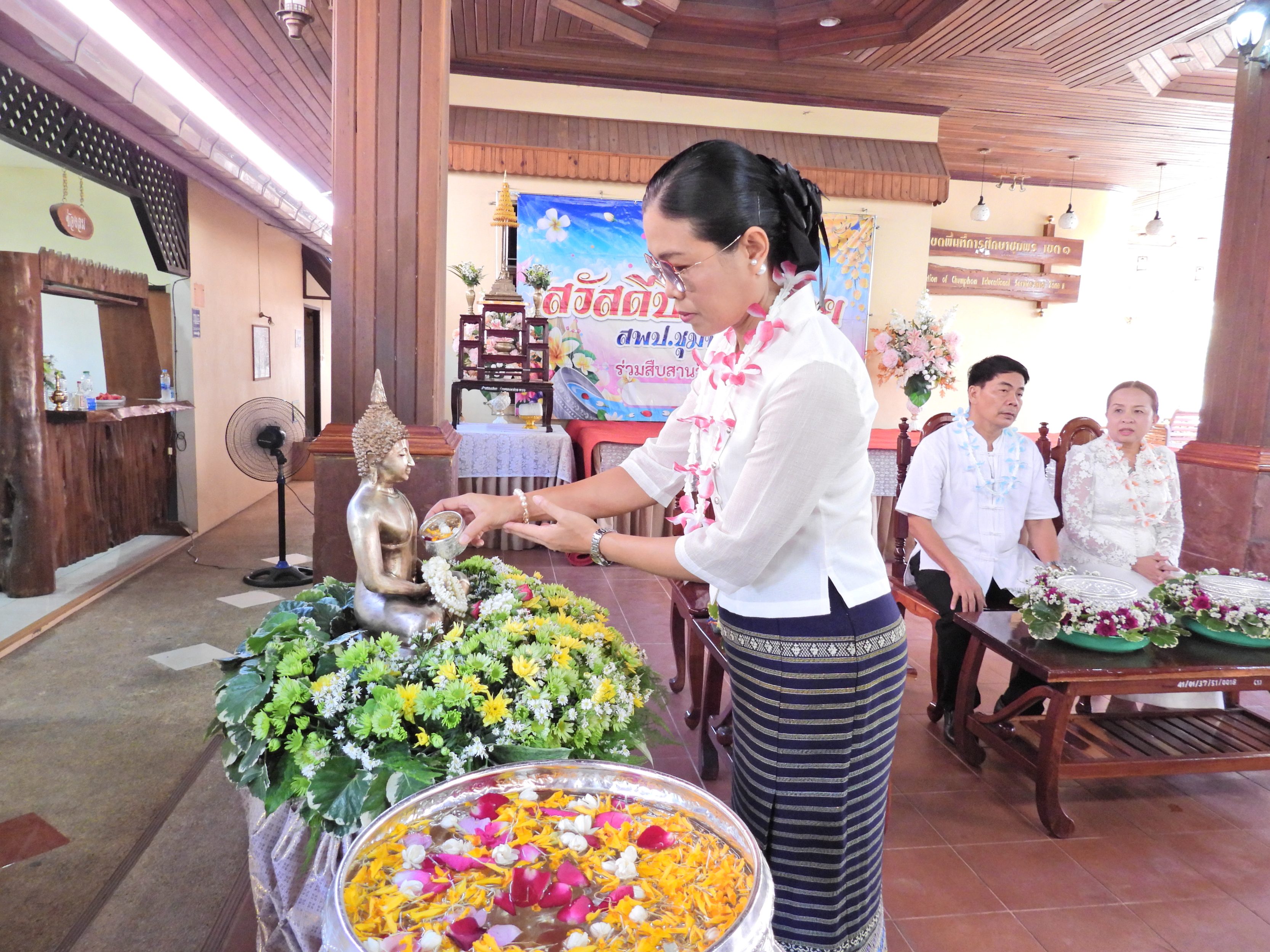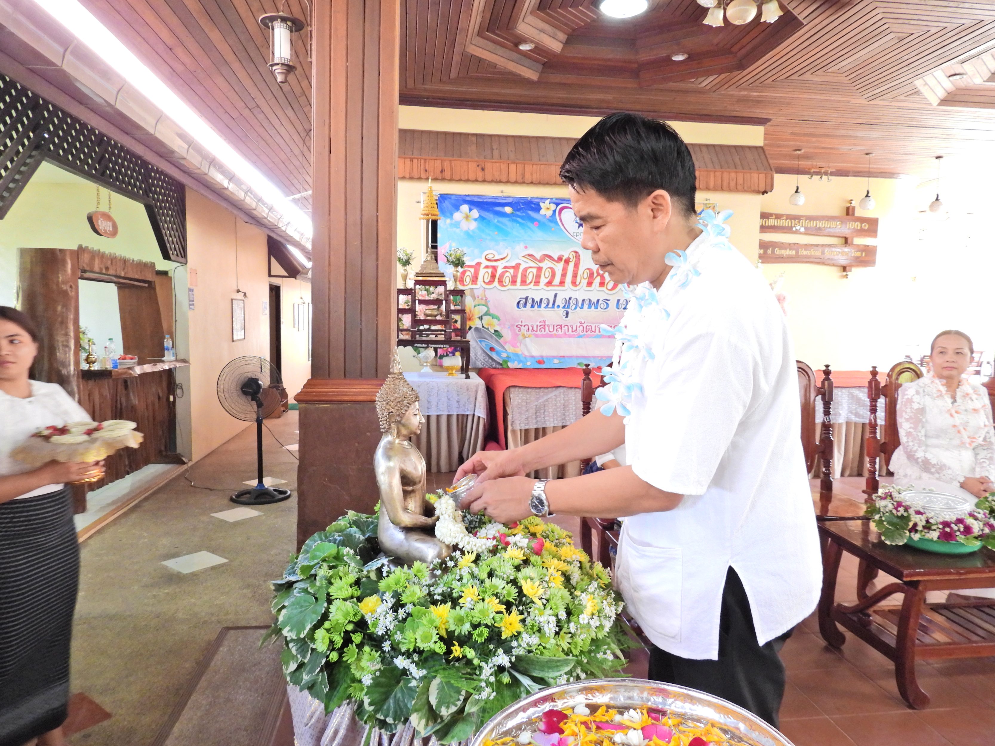 วันที่ 9 เมษายน 2569 เวลา 08.30 น. ดร.กันยมาส ชูจีน ผู้อำนวยการสำนักงานเขตพื้นที่การศึกษาประถมศึกษาชุมพร เขต 1 พร้อมด้วย นายไพฑูรย์ ศรีวะสุทธิ์, นายมานิส สลางสิงห์ และ ดร.กฤติกา อินใหม่ รองผู้อำนวยการสำนักงานเขตพื้นที่การศึกษาประถมศึกษาชุมพร เขต 1 และบุคลากรสำนักงานเขตพื้นที่การศึกษาประถมศึกษาชุมพร เขต 1 ร่วมจัดกิจกรรมสืนสานวัฒนธรรมไทยเนื่องในเทศกาลวันสงกรานต์ เพื่อเป็นการสืบสานวัฒนธรรมไทยและเพื่อความเป็นสิริมงคลในการดำเนินชีวิต กิจกรรมประกอบด้วย พิธีสงฆ์, สรงน้ำพระพุทธรูป, รดน้ำขอพรจากผู้บริหารการศึกษา และร่วมรับประทานอาหารร่วมกัน ณ อาคารสโมสร สำนักงานเขตพื้นที่การศึกษาประถมศึกษาชุมพร เขต 1