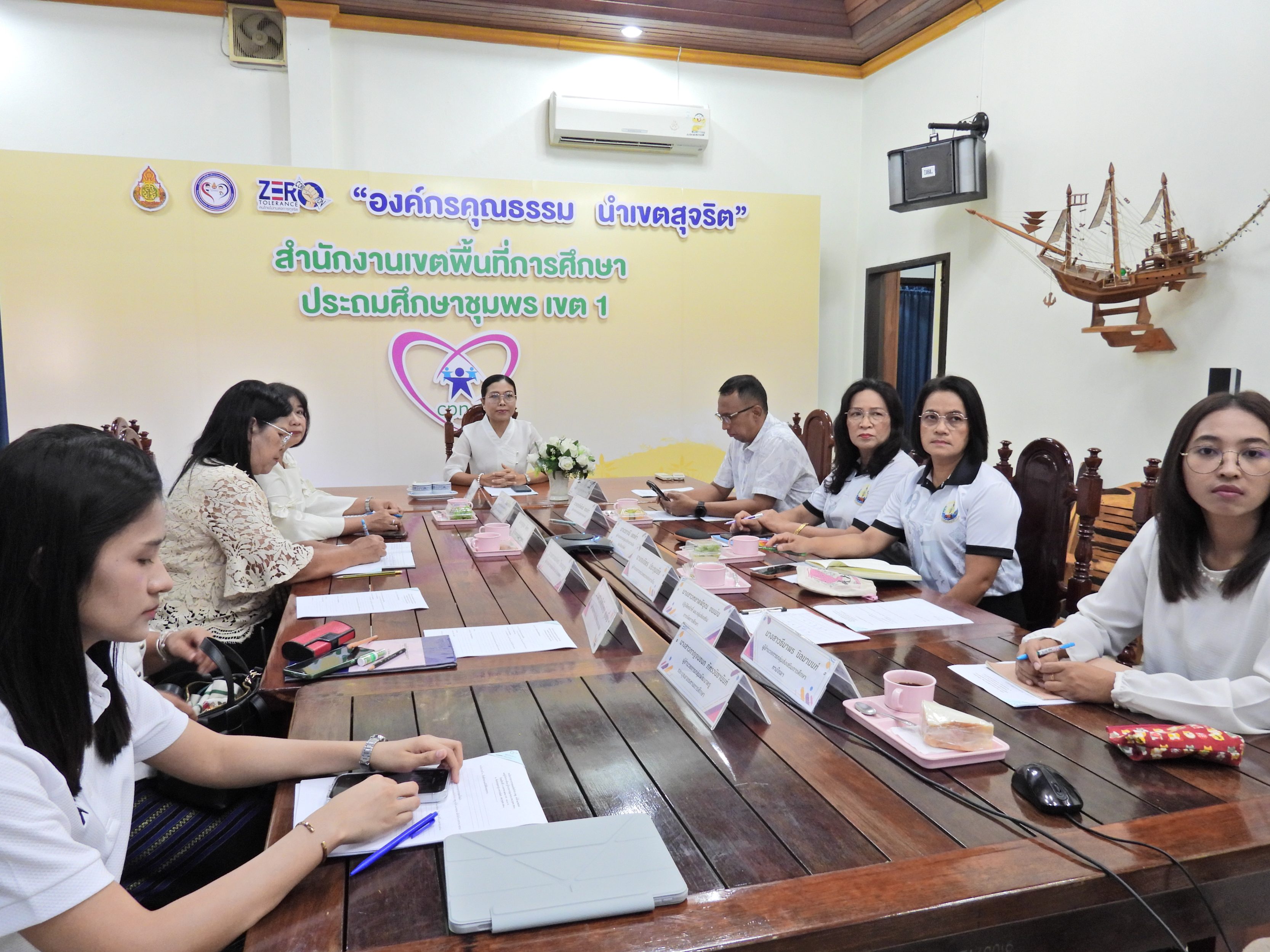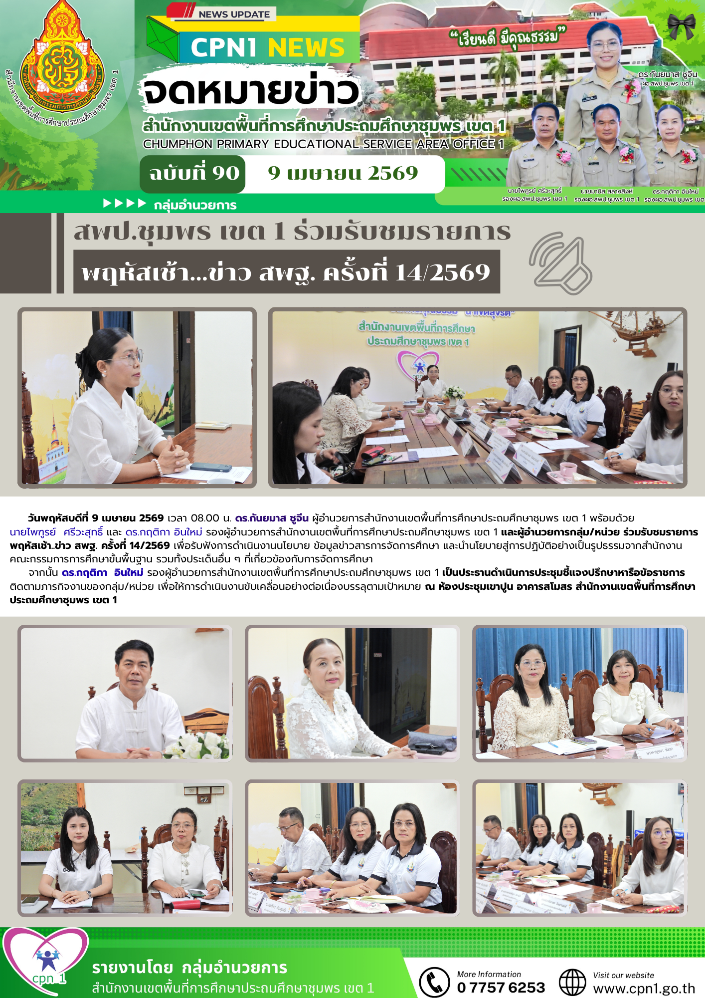 วันพฤหัสบดีที่ 9 เมษายน 2569 เวลา 08.00 น. ดร.กันยมาส ชูจีน ผู้อำนวยการสำนักงานเขตพื้นที่การศึกษาประถมศึกษาชุมพร เขต 1 พร้อมด้วย นายไพฑูรย์ ศรีวะสุทธิ์ และ ดร.กฤติกา อินใหม่ รองผู้อำนวยการสำนักงานเขตพื้นที่การศึกษาประถมศึกษาชุมพร เขต 1 และผู้อำนวยการกลุ่ม/หน่วย ร่วมรับชมรายการพฤหัสเช้า..ข่าว สพฐ. ครั้งที่ 14/2569 เพื่อรับฟังการดำเนินงานนโยบาย ข้อมูลข่าวสารการจัดการศึกษา และนำนโยบายสู่การปฏิบัติอย่างเป็นรูปธรรมจากสำนักงานคณะกรรมการการศึกษาขั้นพื้นฐาน รวมทั้งประเด็นอื่น ๆ ที่เกี่ยวข้องกับการจัดการศึกษา