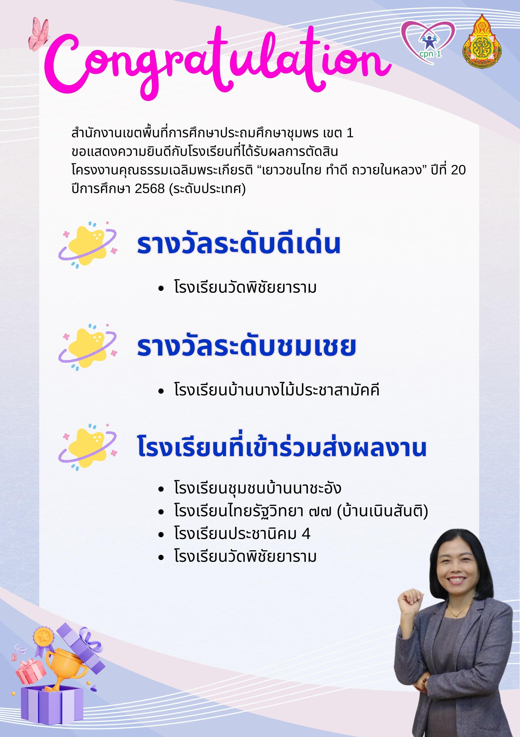 ขอแสดงความยินดีกับโรงเรียนที่ได้รับผลการตัดสินโครงงานคุณธรรมเฉลิมพระเกียรติ “เยาวชนไทย ทำดี ถวายในหลวง” ปีที่ 20 ปีการศึกษา 2568 (ระดับประเทศ) 10 เมษายน 256910 เมษายน 2026 กลุ่มส่งเสริมการจัดการศึกษา สพป.ชพ.1 กลุ่มส่งเสริมการจัดการศึกษา, ข่าวและกิจกรรม สพป.ชพ.1, ข่าวและกิจกรรมกลุ่มส่งเสริมการจัดการศึกษา FacebookFacebookXXLINELine กลุ่มส่งเสริมการจัดการศึกษา สพป.ชพ.1