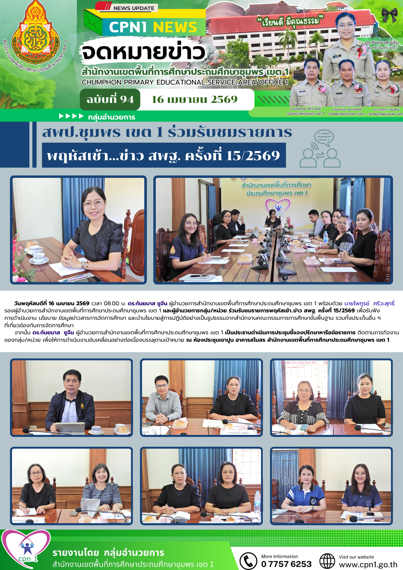 วันพฤหัสบดีที่ 16 เมษายน 2569 เวลา 08.00 น. ดร.กันยมาส ชูจีน ผู้อำนวยการสำนักงานเขตพื้นที่การศึกษาประถมศึกษาชุมพร เขต 1 พร้อมด้วย นายไพฑูรย์ ศรีวะสุทธิ์ รองผู้อำนวยการสำนักงานเขตพื้นที่การศึกษาประถมศึกษาชุมพร เขต 1 และผู้อำนวยการกลุ่ม/หน่วย ร่วมรับชมรายการพฤหัสเช้า..ข่าว สพฐ. ครั้งที่ 15/2569 เพื่อรับฟังการดำเนินงาน นโยบาย ข้อมูลข่าวสารการจัดการศึกษา และนำนโยบายสู่การปฏิบัติอย่างเป็นรูปธรรมจากสำนักงานคณะกรรมการการศึกษาขั้นพื้นฐาน รวมทั้งประเด็นอื่น ๆที่เกี่ยวข้องกับการจัดการศึกษา