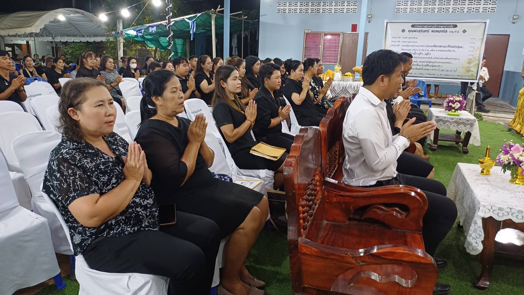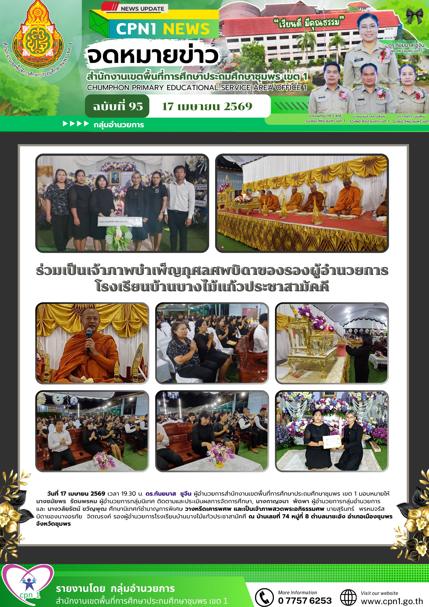วันที่ 17 เมษายน 2569 เวลา 19.30 น. ดร.กันยมาส ชูจีน ผู้อำนวยการสำนักงานเขตพื้นที่การศึกษาประถมศึกษาชุมพร เขต 1 มอบหมายให้ นางชมัยพร รัตนพรหม ผู้อำนวยการกลุ่มนิเทศ ติดตามและประเมินผลการจัดการศึกษา, นางกาญจนา พัดพา ผู้อำนวยการกลุ่มอำนวยการ และ นางวลัยรัตน์ ขวัญพุฒ ศึกษานิเทศก์ชำนาญการพิเศษ วางหรีดเคารพศพ และเป็นเจ้าภาพสวดพระอภิธรรมศพ นายสุรินทร์ พรหมจรัส บิดาของนางอรทัย จิตณรงค์ รองผู้อำนวยการโรงเรียนบ้านบางไม้แก้วประชาสามัคคี ณ บ้านเลขที่ 74 หมู่ที่ 8 ตำบลนาชะอัง อำเภอเมืองชุมพร จังหวัดชุมพร