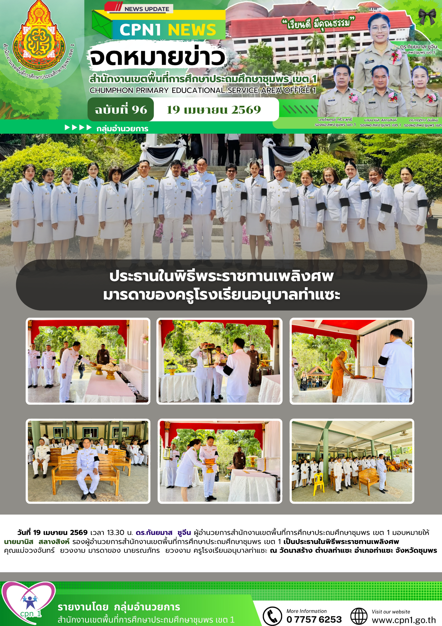 วันที่ 19 เมษายน 2569 เวลา 13.30 น. ดร.กันยมาส ชูจีน ผู้อำนวยการสำนักงานเขตพื้นที่การศึกษาประถมศึกษาชุมพร เขต 1 มอบหมายให้ นายมานิส สลางสิงห์ รองผู้อำนวยการสำนักงานเขตพื้นที่การศึกษาประถมศึกษาชุมพร เขต 1 เป็นประธานในพิธีพระราชทานเพลิงศพ คุณแม่จวงจันทร์ ยวงงาม มารดาของ นายรณภัทร ยวงงาม ครูโรงเรียนอนุบาลท่าแซะ ณ วัดนาสร้าง ตำบลท่าแซะ อำเภอท่าแซะ จังหวัดชุมพร