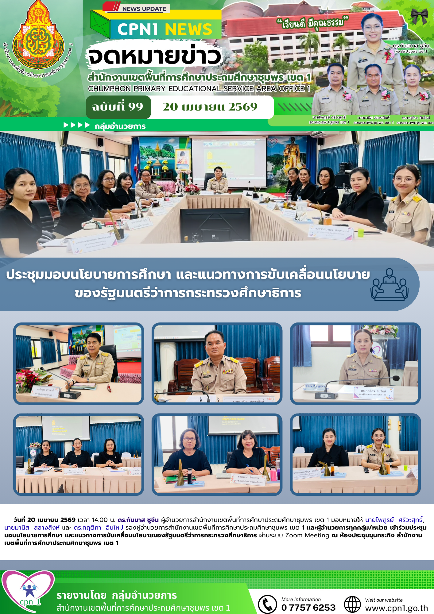วันที่ 20 เมษายน 2569 เวลา 14.00 น. ดร.กันมาส ชูจีน ผู้อำนวยการสำนักงานเขตพื้นที่การศึกษาประถมศึกษาชุมพร เขต 1 มอบหมายให้ นายไพฑูรย์ ศรีวะสุทธิ์, นายมานิส สลางสิงห์ และ ดร.กฤติกา อินใหม่ รองผู้อำนวยการสำนักงานเขตพื้นที่การศึกษาประถมศึกษาชุมพร เขต 1 เเละผู้อำนวยการทุกกลุ่ม/หน่วย เข้าร่วมประชุมมอบนโยบายการศึกษา และแนวทางการขับเคลื่อนนโยบายของรัฐมนตรีว่าการกระทรวงศึกษาธิการ ผ่านระบบ Zoom Meeting ณ ห้องประชุมขุนกระทิง สำนักงานเขตพื้นที่การศึกษาประถมศึกษาชุมพร เขต 1