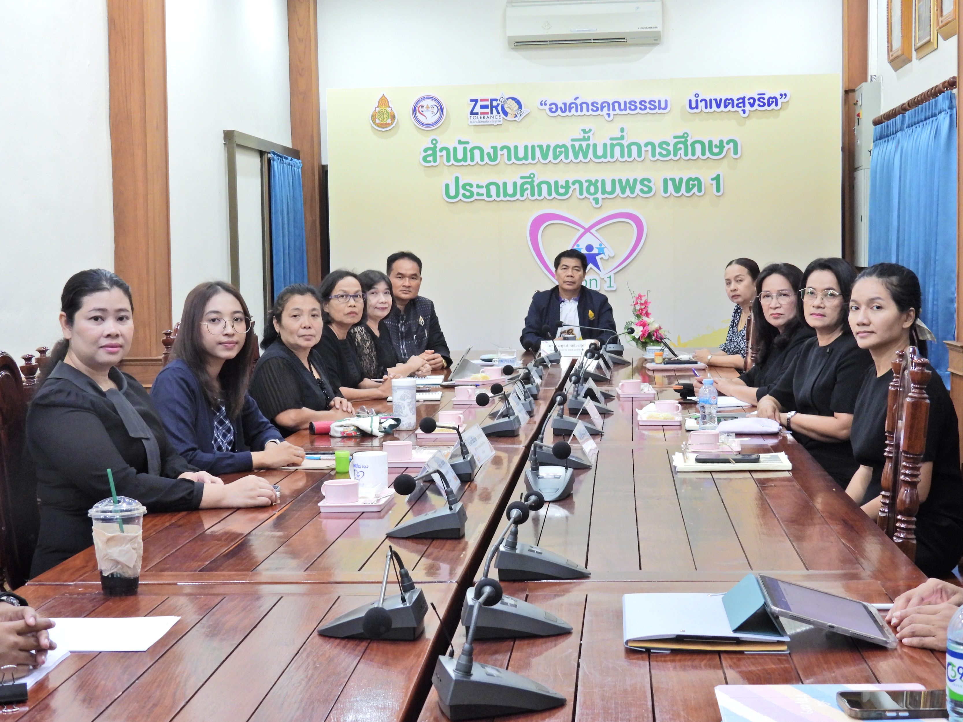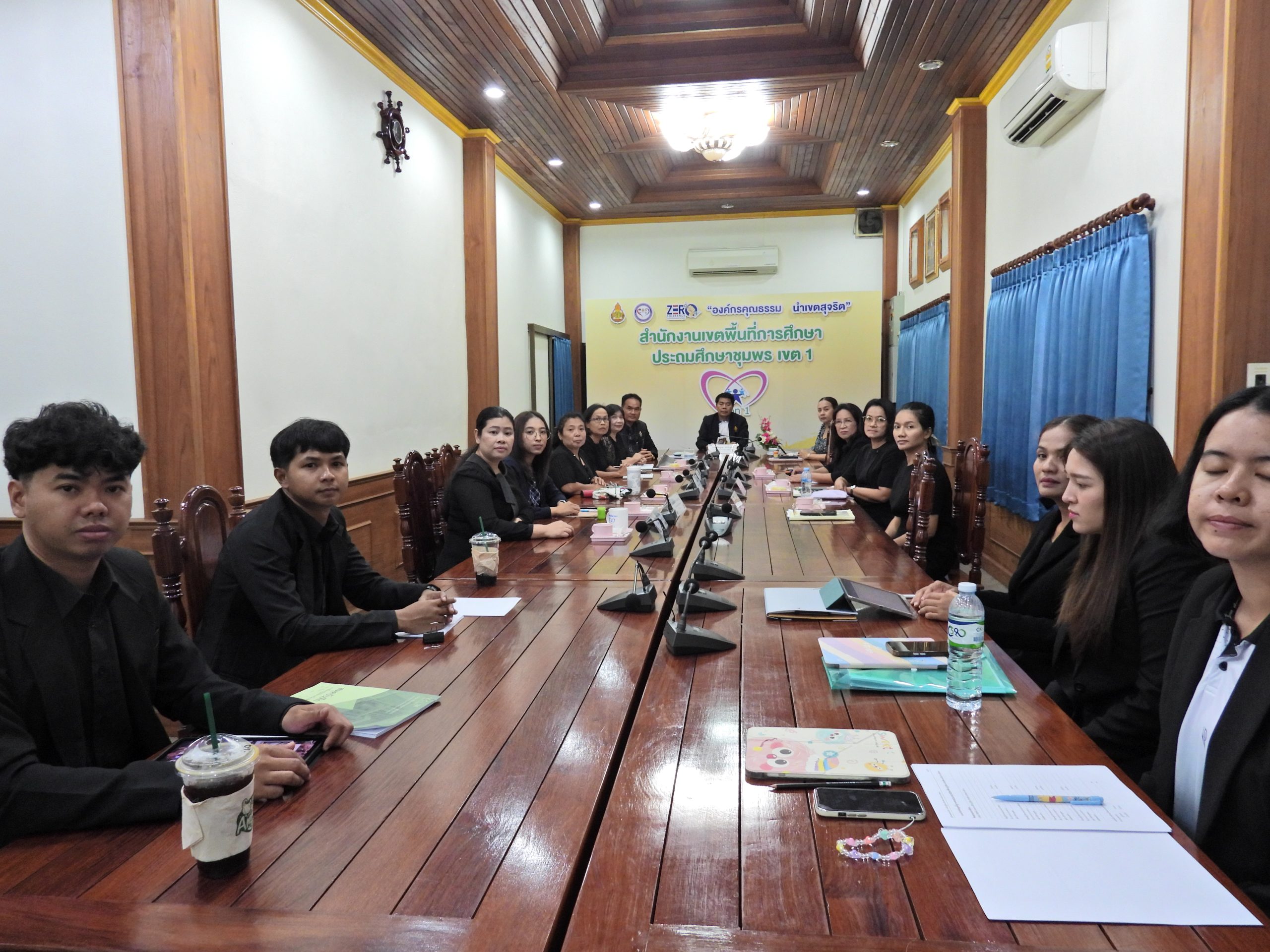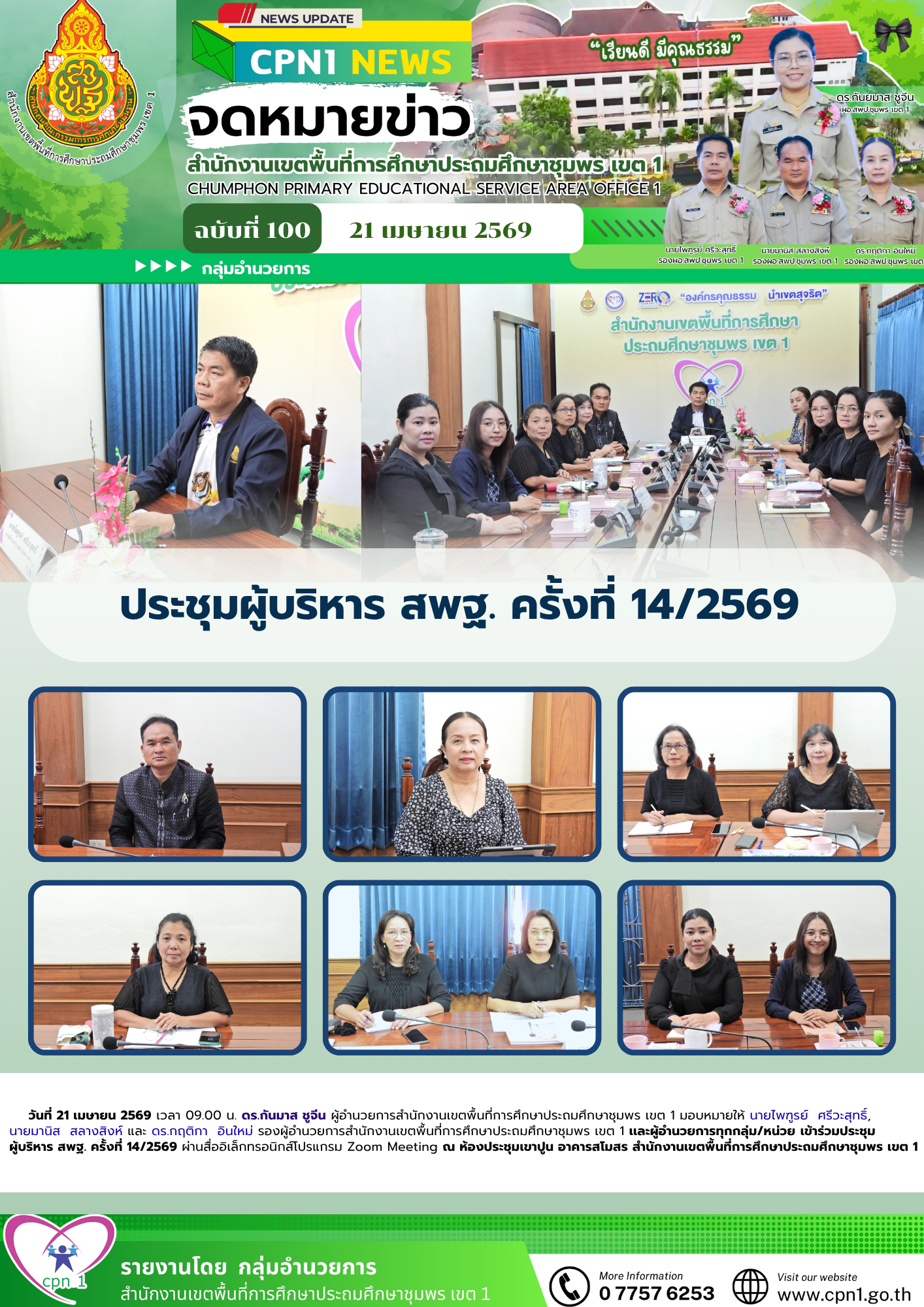 วันที่ 21 เมษายน 2569 เวลา 09.00 น. ดร.กันมาส ชูจีน ผู้อำนวยการสำนักงานเขตพื้นที่การศึกษาประถมศึกษาชุมพร เขต 1 มอบหมายให้ นายไพฑูรย์ ศรีวะสุทธิ์, นายมานิส สลางสิงห์ และ ดร.กฤติกา อินใหม่ รองผู้อำนวยการสำนักงานเขตพื้นที่การศึกษาประถมศึกษาชุมพร เขต 1 เเละผู้อำนวยการทุกกลุ่ม/หน่วย เข้าร่วมประชุมผู้บริหาร สพฐ. ครั้งที่ 14/2569 ผ่านสื่ออิเล็กทรอนิกส์โปรแกรม Zoom Meeting ณ ห้องประชุมเขาปูน อาคารสโมสร สำนักงานเขตพื้นที่การศึกษาประถมศึกษาชุมพร เขต 1
