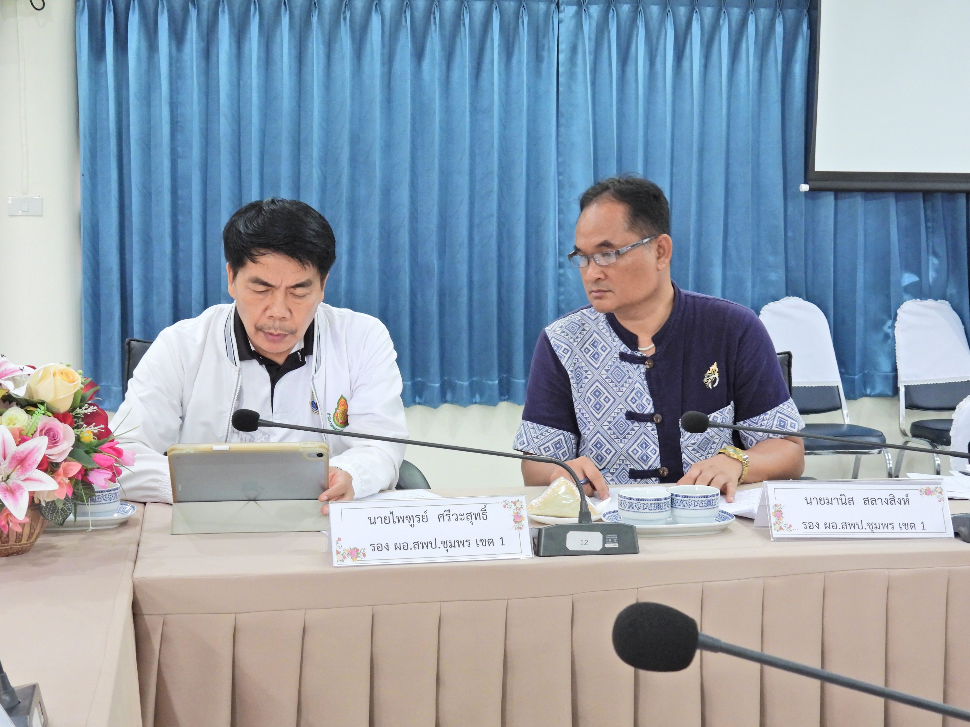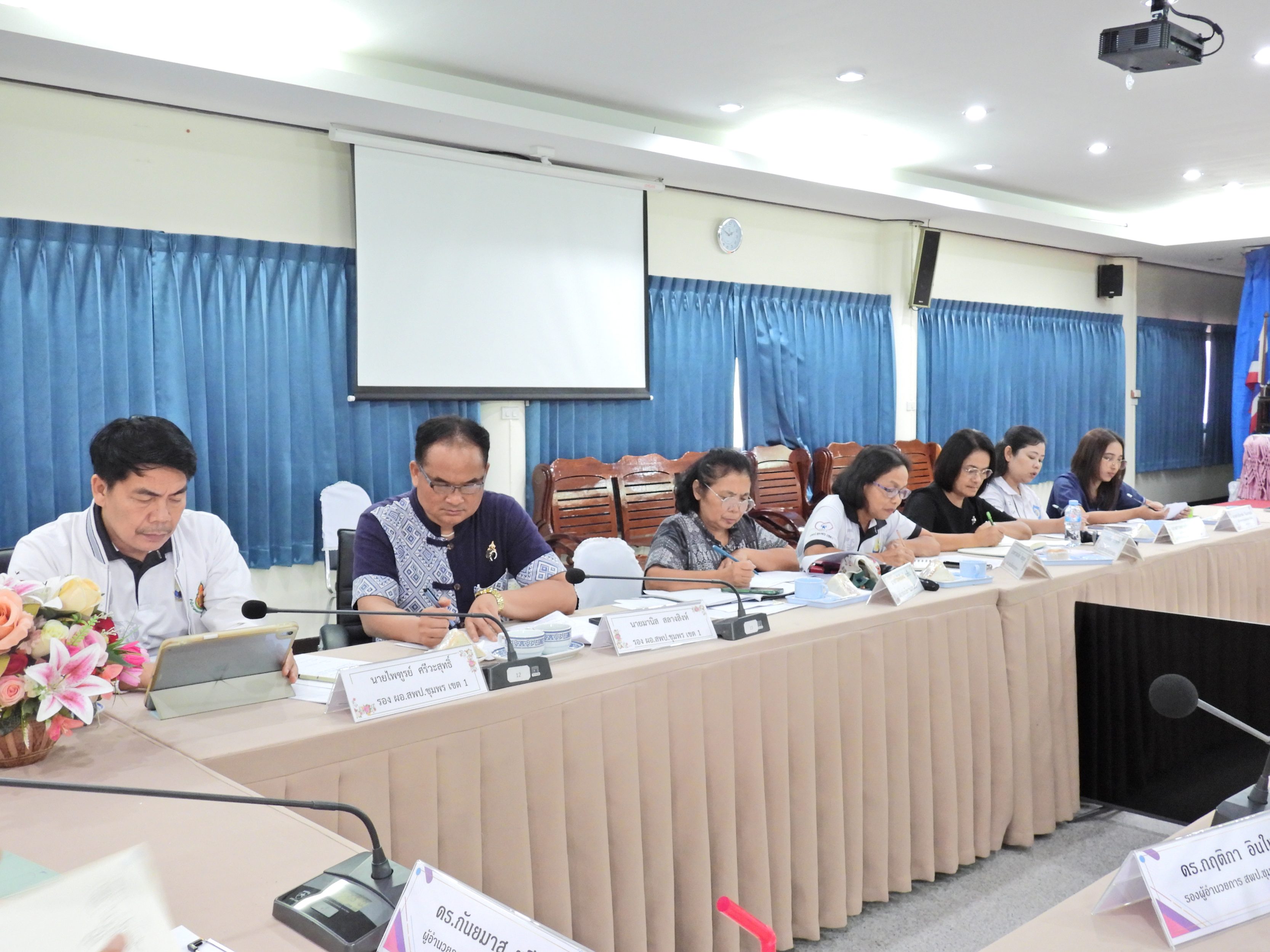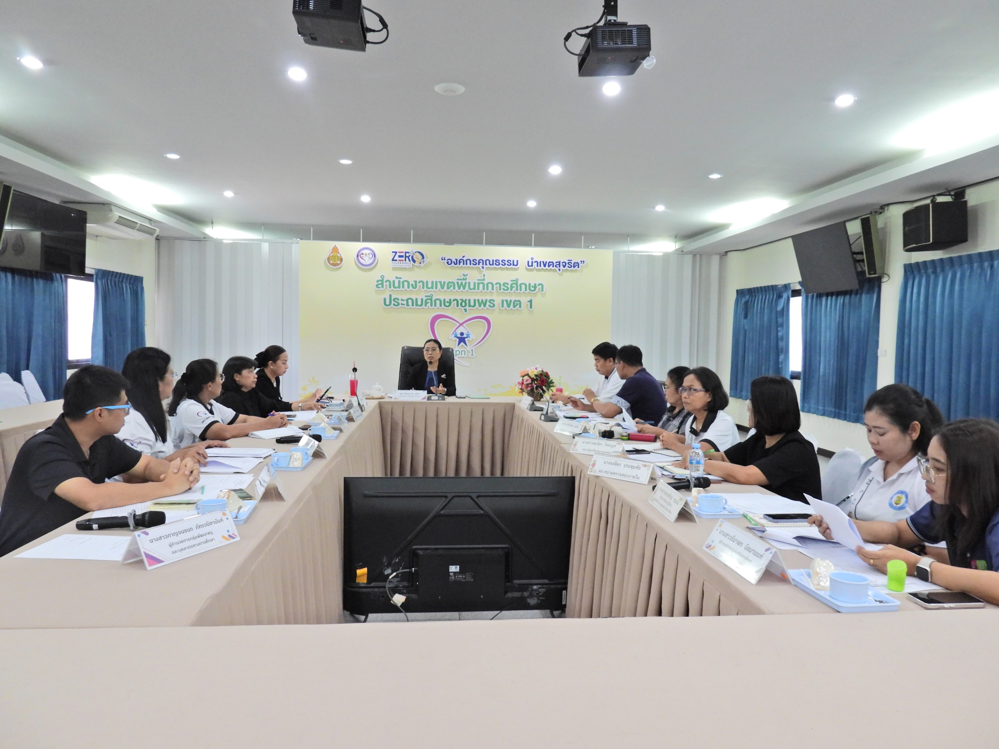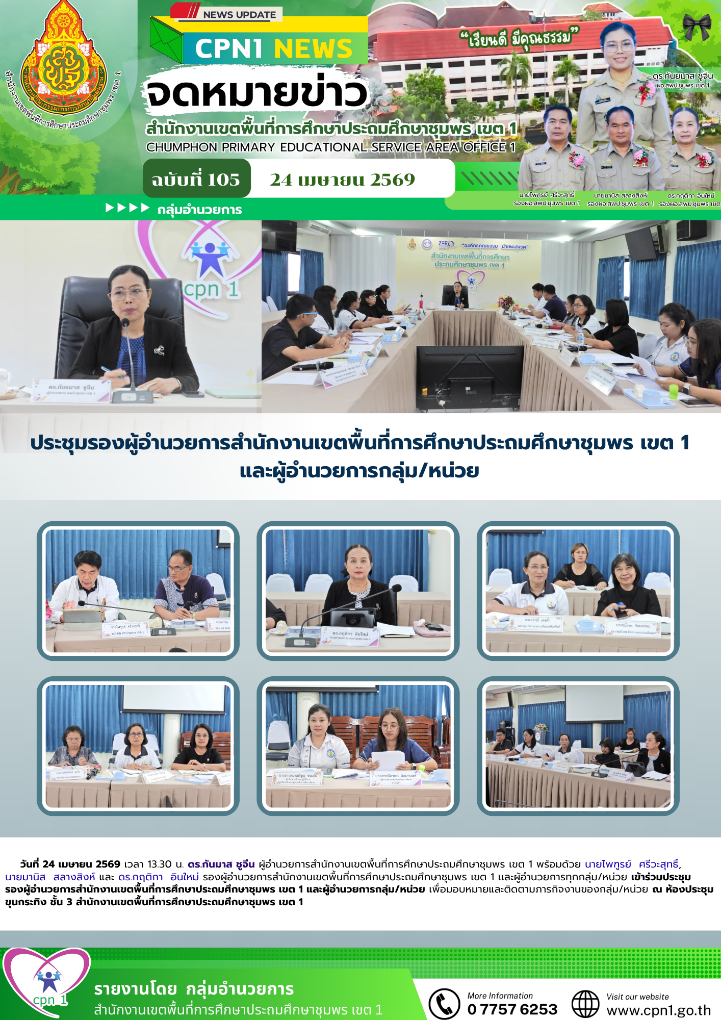 วันที่ 24 เมษายน 2569 เวลา 13.30 น. ดร.กันมาส ชูจีน ผู้อำนวยการสำนักงานเขตพื้นที่การศึกษาประถมศึกษาชุมพร เขต 1 พร้อมด้วย นายไพฑูรย์ ศรีวะสุทธิ์, นายมานิส สลางสิงห์ และ ดร.กฤติกา อินใหม่ รองผู้อำนวยการสำนักงานเขตพื้นที่การศึกษาประถมศึกษาชุมพร เขต 1 เเละผู้อำนวยการทุกกลุ่ม/หน่วย เข้าร่วมประชุมรองผู้อำนวยการสำนักงานเขตพื้นที่การศึกษาประถมศึกษาชุมพร เขต 1 และผู้อำนวยการกลุ่ม/หน่วย เพื่อมอบหมายและติดตามภารกิจงานของกลุ่ม/หน่วย ณ ห้องประชุมขุนกระทิง ชั้น 3 สำนักงานเขตพื้นที่การศึกษาประถมศึกษาชุมพร เขต 1