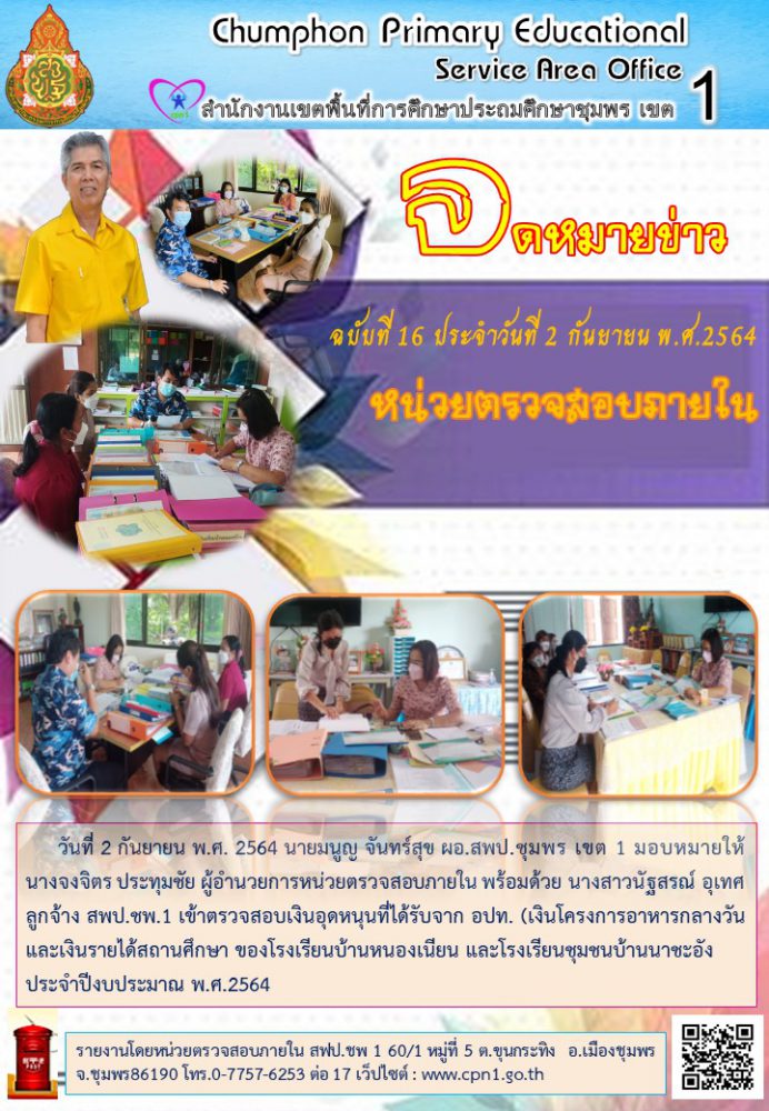 วันที่ 2 กันยายน พ.ศ. 2564 นายมนูญ จันทร์สุข ผอ.สพป.ชุมพร เขต 1 มอบหมายให้ นางจงจิตร ประทุมชัย ผู้อำนวยการหน่วยตรวจสอบภายใน พร้อมด้วย นางสาวนัฐสรณ์ อุเทศ ลูกจ้าง สพป.ชพ.1 เข้าตรวจสอบเงินอุดหนุนที่ได้รับจาก อปท. (เงินโครงการอาหารกลางวัน และเงินรายได้สถานศึกษา ของโรงเรียนบ้านหนองเนียน และโรงเรียนชุมชนบ้านนาชะอัง ประจำปีงบประมาณ พ.ศ.2564
