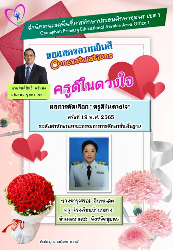 ขอแสดงความยินดี ผลการคัดเลือก “ครูดีในดวงใจ” ครั้งที่ 19 พ.ศ. 2565 ระดับ สพฐ. 23 พฤศจิกายน 2564 กลุ่มพัฒนาครูและบุคลากรทางการศึกษา สพป.ชพ.1 ข่าวและกิจกรรมกลุ่มพัฒนาครูและบุคลากรทางการศึกษา, งานยกย่องเชิดชูเกียรติ/คัดเลือกรางวัล, ไม่มีหมวดหมู่ FacebookFacebookXXLINELine กลุ่มพัฒนาครูและบุคลากรทางการศึกษา สพป.ชพ.1
