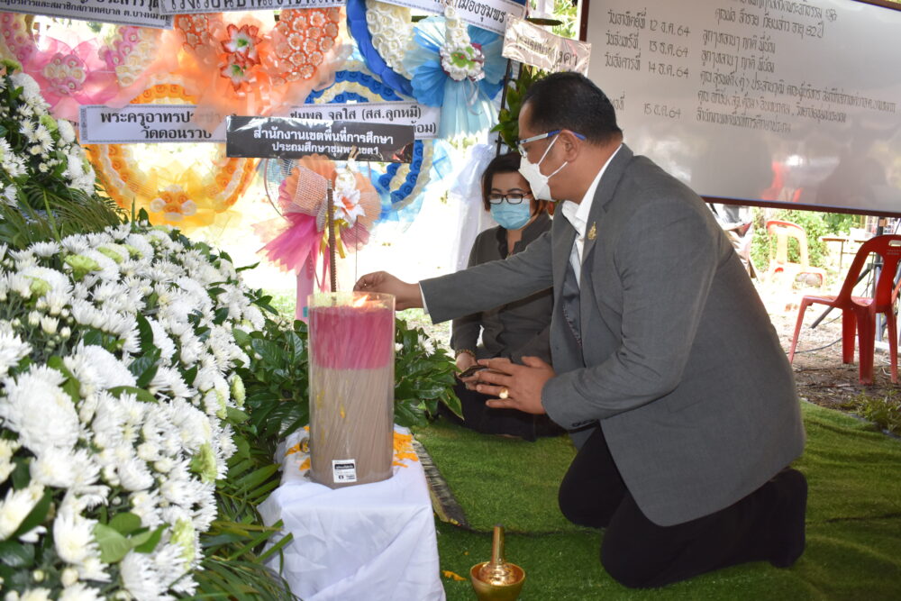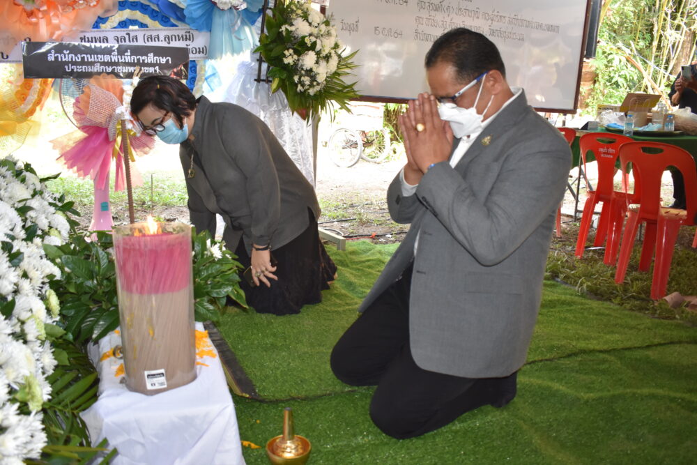 นายศักดิ์สิทธิ์ แร่ทอง ผอ.สพป.ชพ.1 พร้อมด้วยบุคลากรในสำนักงานเขตพื้นที่การศึกษาประถมศึกษาชุมพร เขต 1 วางหรีดเคารพศพ นายสำรวย เวียนสาว