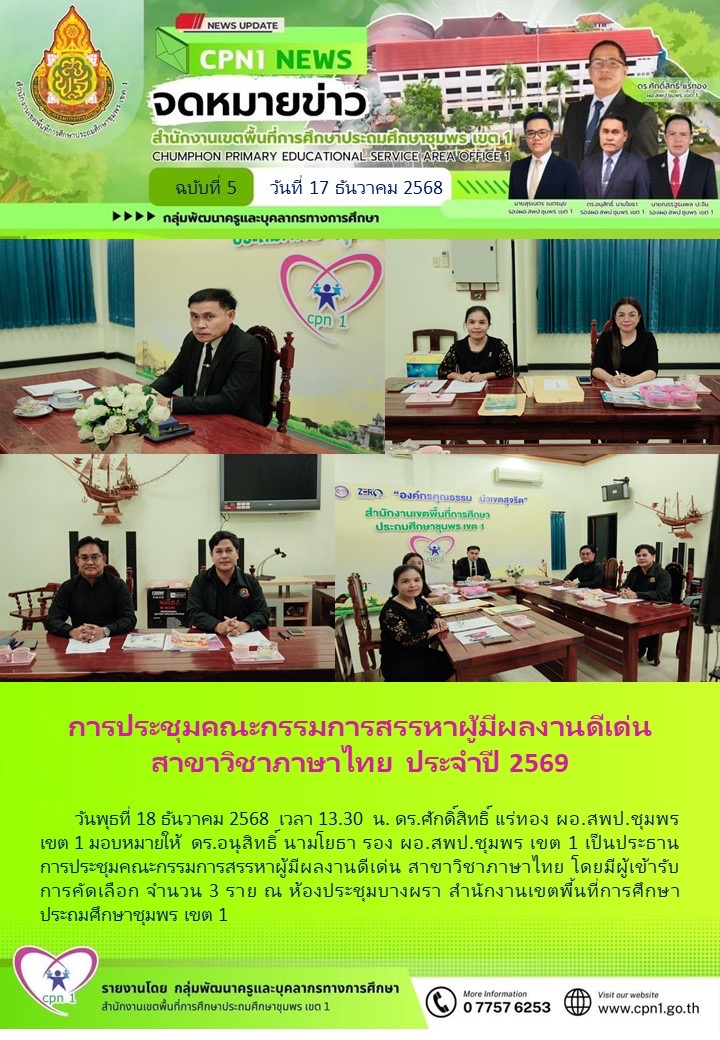 กลุ่มพัฒนาครูและบุคลากรทางการศึกษา DSC00781สำนักงานเขตพื้นที่การศึกษาประถมศึกษาชุมพร เขต 1 กลุ่มพัฒนาครูและบุคลากรทางการศึกษา การประชุมคณะกรรมการสรรหาผู้มีผลงานดีเด่น สาขาวิชาภาษาไทย ประจำปี 2569 18 ธันวาคม 256818 ธันวาคม 2025 การอบรมโครงการพัฒนาสมรรถนะการบริหารสถานศึกษามิติใหม่ของผู้บริหารสถานศึกษา 18 ธันวาคม 256818 ธันวาคม 2025 แนวทางการอนุญาตให้บุคลากรในสังกัดทำหน้าที่ผู้ประเมินคุณภาพภายนอก 02 พฤศจิกายน 256802 พฤศจิกายน 2025 กลุ่มพัฒนาครูและบุคลากรทางการศึกษา พบปะนักศึกษาฝึกประสบการณ์วิชาชีพการบริหาร 16 ตุลาคม 256816 ตุลาคม 2025 สัมมนาทางวิชาการของสมาคมรองผู้อำนวยการสำนักงานเขตพื้นที่การศึกษา (ประเทศไทย) เรื่อง "การยกระดับคุณภาพผู้บริหารการศึกษาและวิชาชีพ" 09 มิถุนายน 256809 มิถุนายน 2025 การประเมินสัมฤทธิผลการปฏิบัติงานในหน้าที่ ตำแหน่ง รองผู้อำนวยการสำนักงานเขตพื้นที่การศึกษา ในระยะเวลา 1 ปี ครั้งที่ 1 25 เมษายน 256825 เมษายน 2025 AI กับการพัฒนาการจัดการศึกษา ในระดับการศึกษาขั้นพื้นฐาน 21 มีนาคม 256825 มีนาคม 2025 สพป.ชุมพร เขต 1 ร่วมรับชมรายการ พฤหัสเช้า ข่าว สพฐ. ครั้งที่ 49/2567 12 ธันวาคม 2567 กิจกรรมของกลุ่ม 24 มิถุนายน 2568 รายงานผลการบริหารและพัฒนาทรัพยากรบุคคล ปีงบประมาณ พ.ศ.2567 กลุ่มบริหารงานบุคคล สพป.ชพ.1 รายงานผลการบริหารและพัฒนาทรัพยากรบุคคลประจำปี By : กลุ่มบริหารงานบุคคล สพป.ชพ.1 18 เมษายน 2568 เกียรติบัตรการอบรมหลักสูตร "AI" กับการพัฒนาการจัดการศึกษาในระดับการศึกษาขั้นพื้นฐาน สพป.ชุมพร เขต 1 กลุ่มพัฒนาครูและบุคลากรทางการศึกษา By : สพป.ชุมพร เขต 1 25 มิถุนายน 2567 รายงานผลการบริหารและพัฒนาทรัพยากรบุคคลประจำปีงบประมาณ พ.ศ.2566 กลุ่มบริหารงานบุคคล สพป.ชพ.1 ข่าวและกิจกรรม สพป.ชพ.1, รายงานผลการบริหารและพัฒนาทรัพยากรบุคคลประจำปี By : กลุ่มบริหารงานบุคคล สพป.ชพ.1 30 พฤษภาคม 2567 รายงานผลการดำเนินการอบรมเชิงปฏิบัติการเสริมสร้างกลุ่มผู้นำองค์ความรู้สู่การเปลี่ยนแปลงด้านการบริหารงานบุคคล กลุ่มบริหารงานบุคคล สพป.ชพ.1 ข่าวและกิจกรรม สพป.ชพ.1, รายงานผลการบริหารและพัฒนาทรัพยากรบุคคลประจำปี By : กลุ่มบริหารงานบุคคล สพป.ชพ.1 30 พฤษภาคม 2567 รายงานผลการดำเนินการโครงการประชุมเชิงปฏิบัติการเสริมสร้างสมรรถนะข้าราชการครูและบุคลากรทางการศึกษาสู่มืออาชีพ ปีงบประมาณ พ.ศ.2566 กลุ่มบริหารงานบุคคล สพป.ชพ.1 ข่าวและกิจกรรม สพป.ชพ.1, รายงานผลการบริหารและพัฒนาทรัพยากรบุคคลประจำปี By : กลุ่มบริหารงานบุคคล สพป.ชพ.1 19 เมษายน 2567 รายงานผลการดำเนินงานโครงการพัฒนาประสิทธิภาพการบริหารจัดการองค์กรให้เป็นเลิศและศึกษาดูงานผู้บริหารกา
